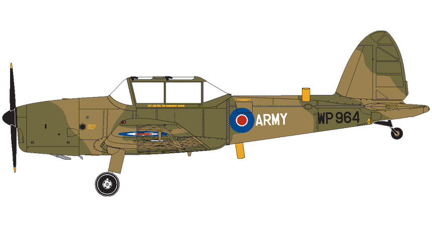 Army Air Corps Chipmunks would later adopt the classic red, white and grey scheme (with black anti-glare panel) which became such a feature of British Chipmunk military training operations, however two of their aircraft would famously adopt a very different appearance. Without doubt, the most distinctive of the Army Air Corps Chipmunks were the two aircraft which were finished in this stunning glossy olive drab and dark earth scheme, whilst they were performing the role of Forward Air Controller aircraft. Wearing these spectacular markings for around ten years, WP964 was usually based at Middle Wallop, but would attract plenty of attention wherever it visited, be that as a general airfield stop-over, or as a static display item at an Airshow event. It is reported in several journals that amongst the Army student pilots at Middle Wallop, this distinctive aircraft was known colloquially as the ‘Spitmunk’ and the opportunity to take a flight in her was highly prized and never refused.