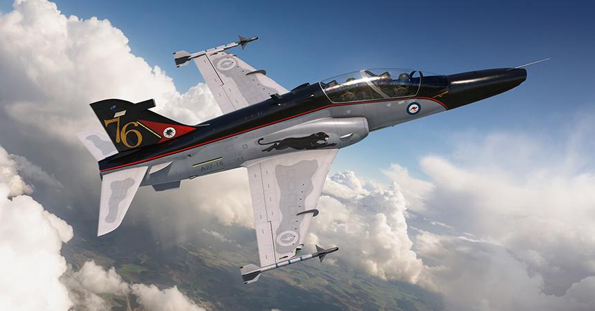 Further enhancing the already attractive scheme adopted by the RAAF on their Hawks, this particular aircraft was to spend some time in the paint shop in preparation for its parent squadron’s 60th anniversary commemorations. RAAF No.76 Squadron’s unit badge features a black panther’s head and this was used as the inspiration for this specially designed scheme. With the top of the spine, fin and complete nose area painted gloss black, red cheat lines and a red fin flash, the large gold 76 on the tail left nobody in any doubt as to who the owners of this stunning aircraft were. A representation of the panther’s head squadron crest was also added to the tail, as were two large black panthers on either side of the fuselage – quite spectacular.